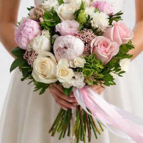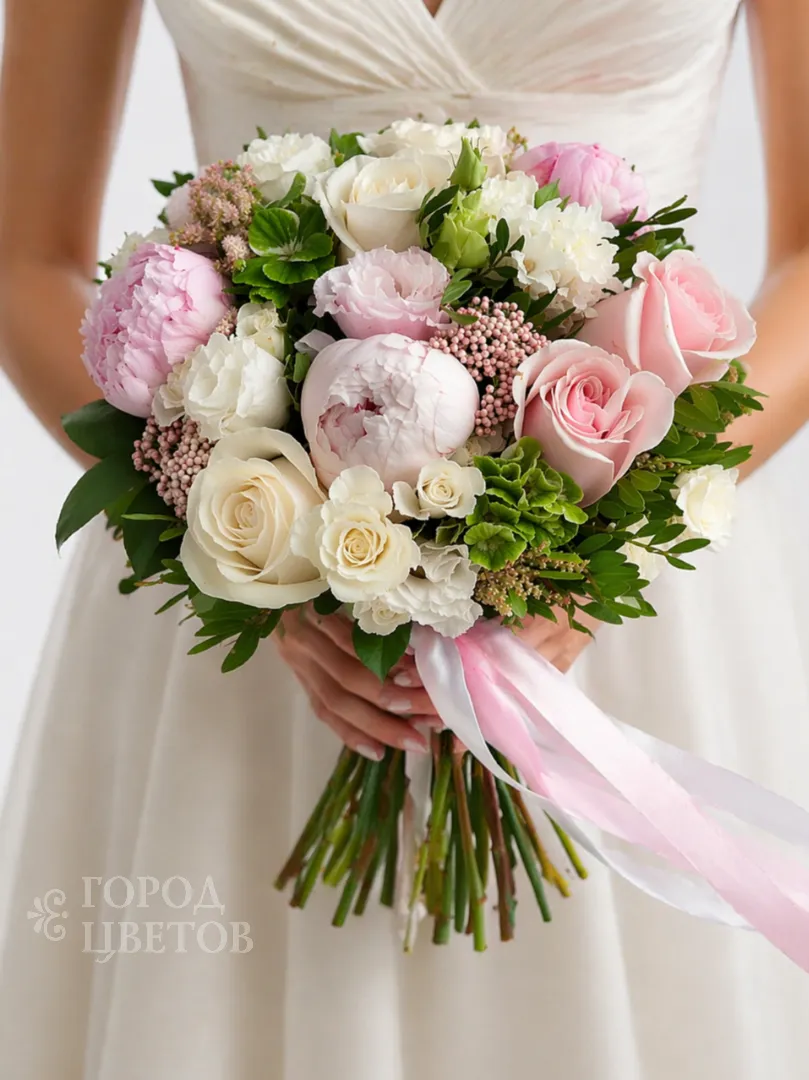 Романтичный букет невесты из пионов и роз в бело-розовой гамме — идеальный выбор для нежной и утончённой свадьбы. Гармоничное сочетание текстур и оттенков создаёт воздушную, естественную композицию.