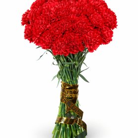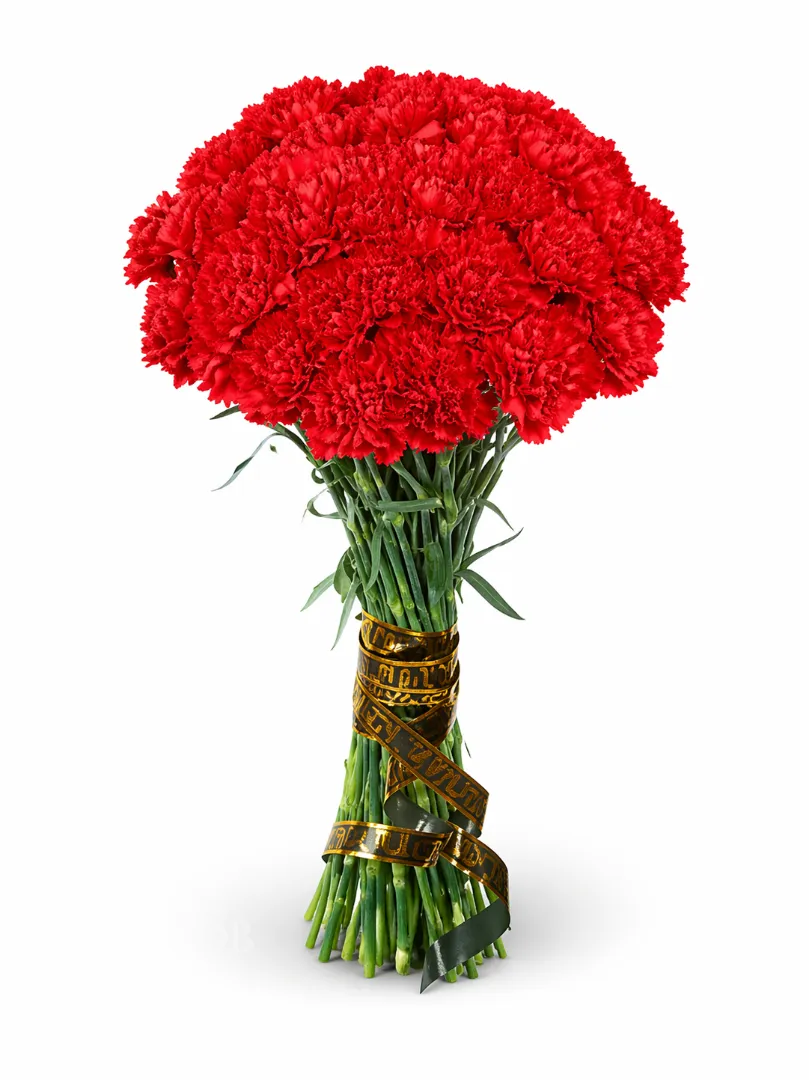 Основу составляет плотный букет из алых гвоздик — символа скорби, уважения и вечной памяти. Однородная форма придаёт композиции целостность и выразительность, акцентируя внимание на насыщенном цвете.